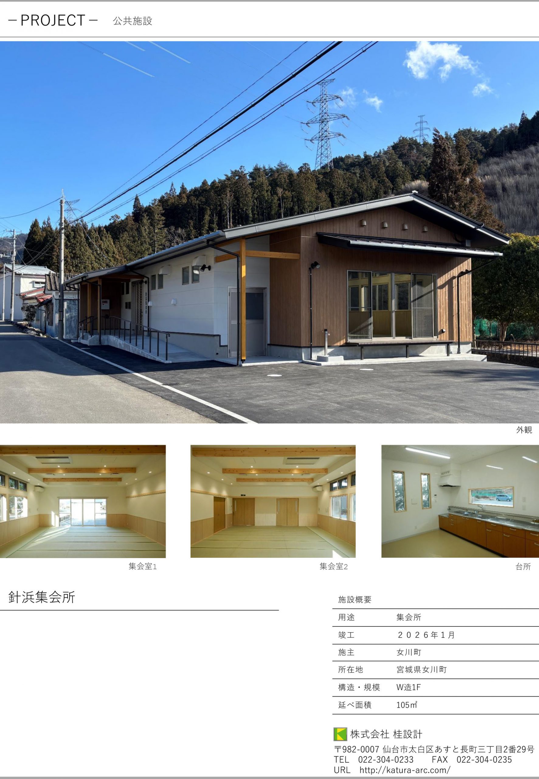 針浜集会所 2026年3月3日 最終更新日時 : 2026年3月3日 小野 外観 集会室1 集会室2 台所 北目集会所 施設概要 施 主 女川町施 工 地 宮城県女川町構造・延べ床面積木造 1F 105㎡竣 工 年 2026年1月 ダウンロード